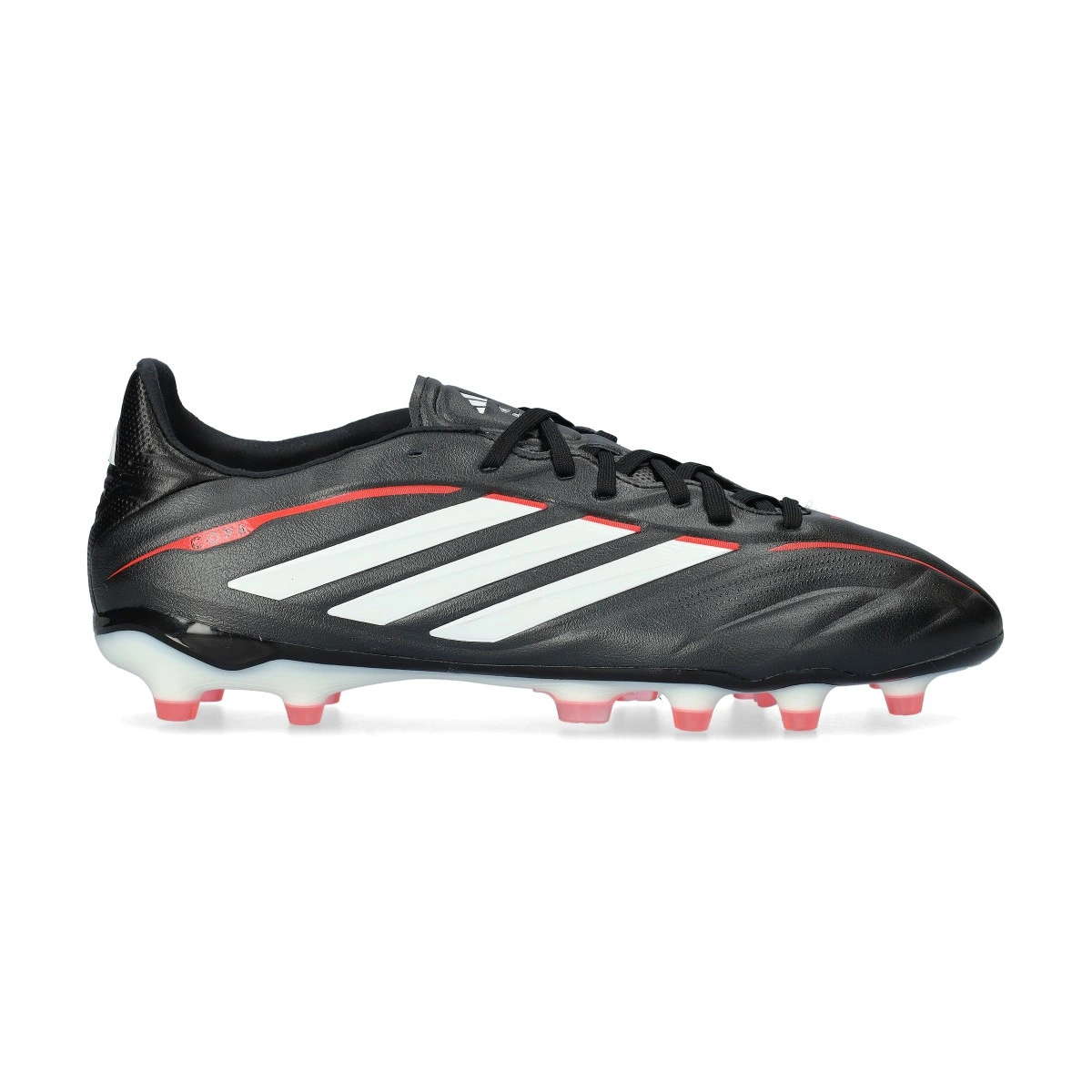 Chuteiras adidas Copa Pure IV Pro FG para adultos. Chuteiras de pele para serem usadas em relva natural. Chuteiras de gama básica na cor Core Black-White-Lucid Red.