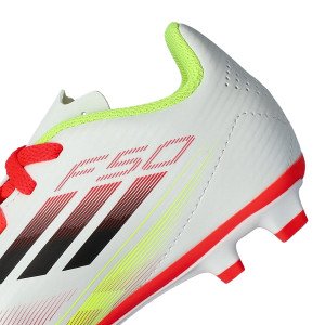 Chuteira F50 Club FG/MG da adidas nas cores Ftwr White-Core Black-Solar Yellow para criança. Chuteira de gama básica.