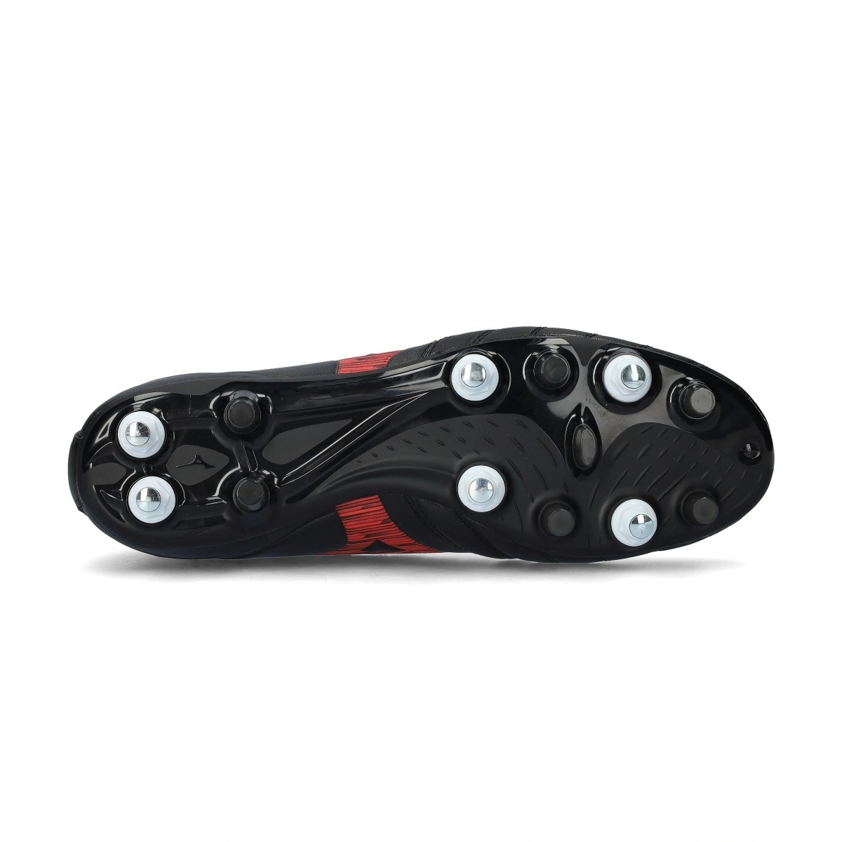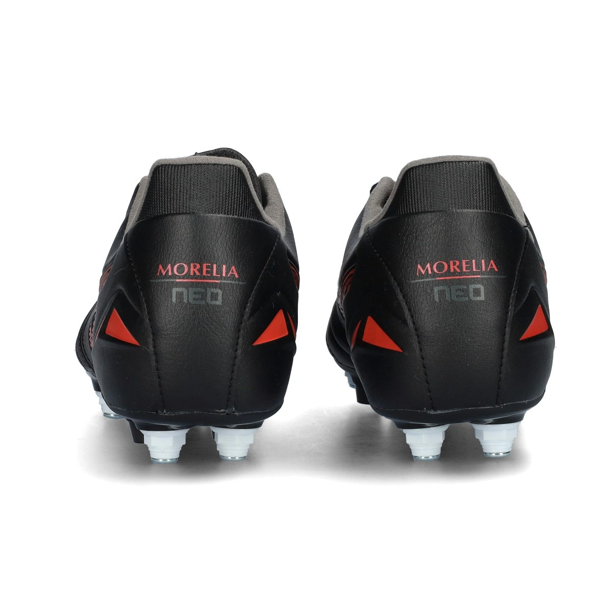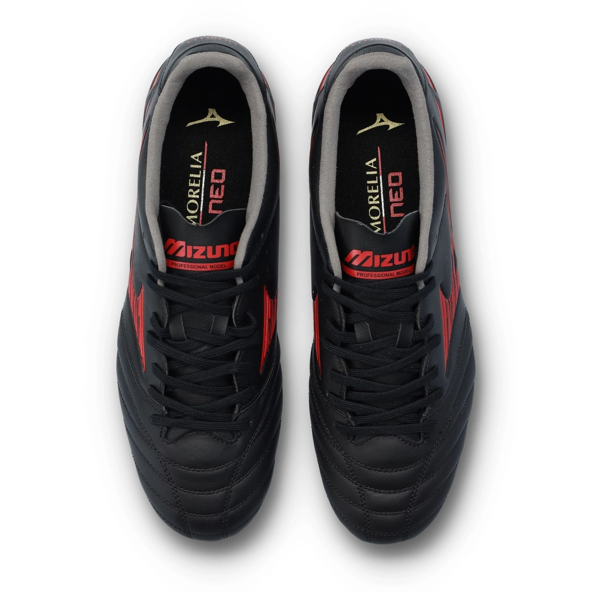 Chuteiras Mizuno Morelia Neo IV Pro Mix para serem usadas em relva natural húmida, na cor Black-Red-Black.