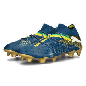 Chuteiras Puma Future 7 Ultimate FG/AG para adultos. Chuteiras de tecido, para serem usadas em relva natural seca ou húmida e em relva artificial de última geração. Chuteiras de gama alta nas cores Sailing Blue-Marine Blue-Pelé Yellow-Grassy.
