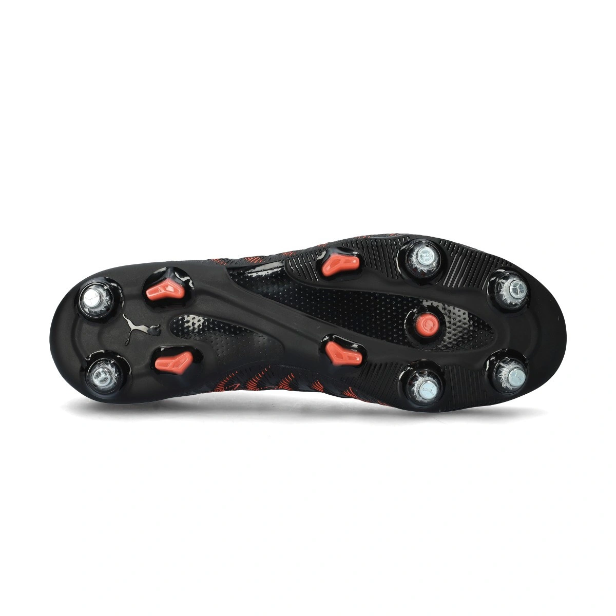 Chuteira Puma Future 9 Match MxSG para adulto. Chuteiras sintéticas para serem usadas em relvados naturais húmidos. Chuteiras de gama básica na cor Puma Black-Glowing Red-Strong Gray.