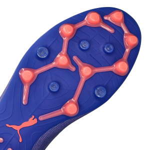Chuteira Puma Ultra 5 Ultimate MG para adultos. Chuteiras em microfibra para serem usadas em terrenos artificiais de primeira geração. Chuteiras de gama alta na cor Lapis Lazuli-White-Sunset Glow.