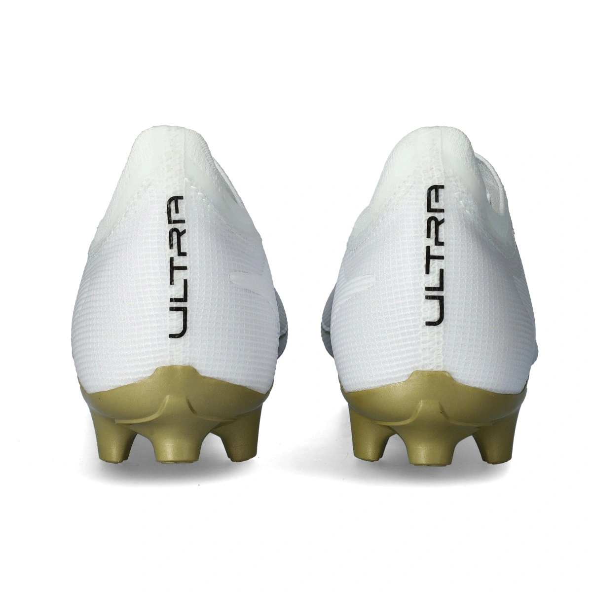 Chuteira Puma Ultra 6 Match FG/AG. Chuteiras sintéticas para serem usadas em relvados naturais ou artificiais. Chuteiras de gama básica na cor White-Metallic Gold-Black.