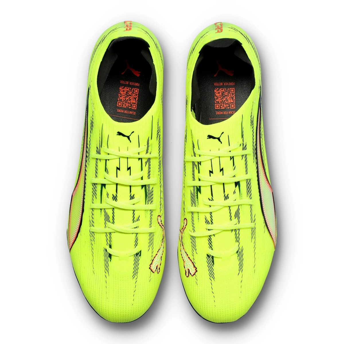 Chuteira Puma Ultra 6 Ultimate Carbon Brilliance FG para mulher. Chuteiras de microfibra para serem usadas em relvado natural. Chuteiras de gama alta na cor Yellow Alert-Black-Silver-Glowing.